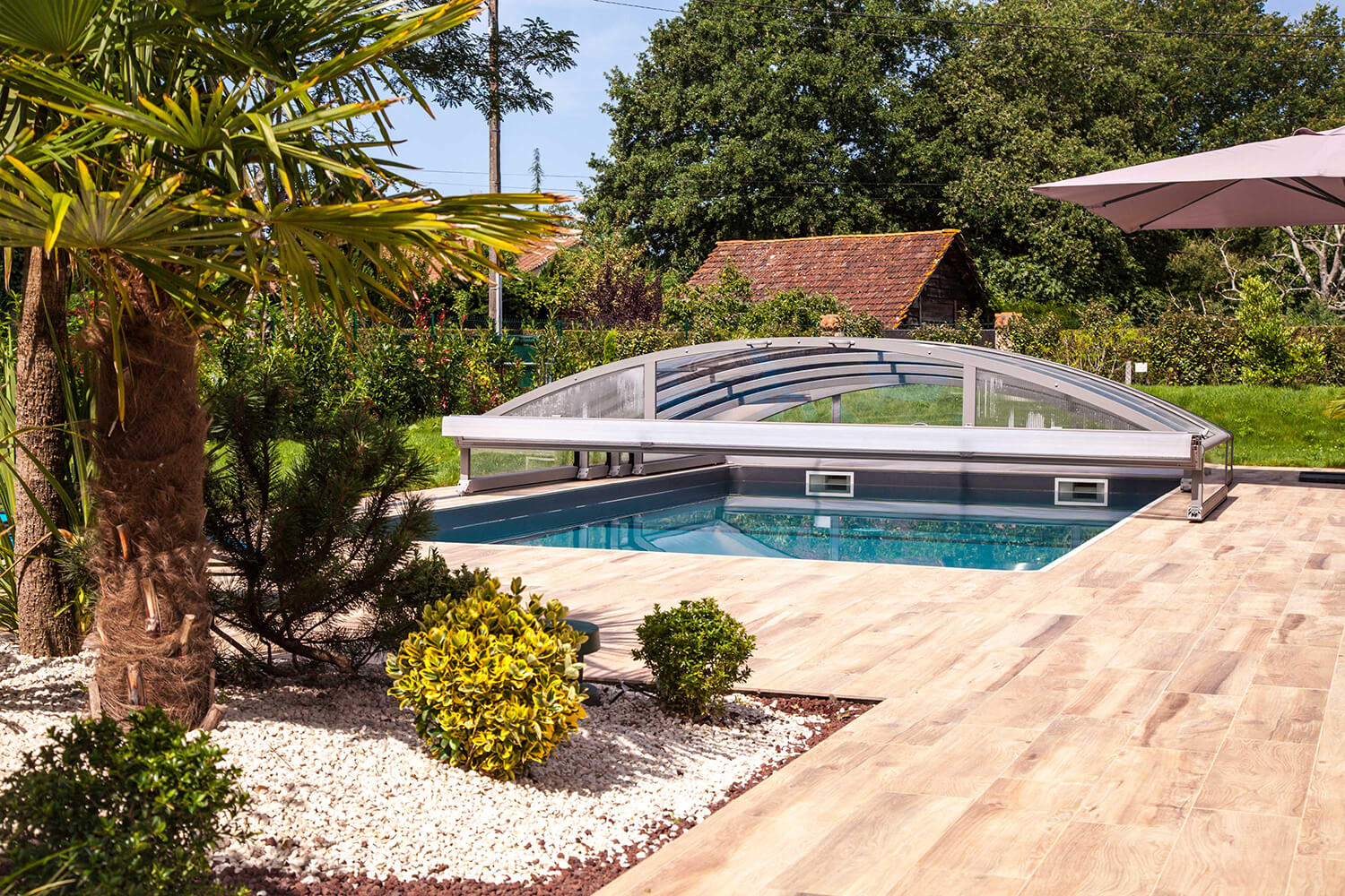 È perfetta per tutti coloro che desiderano approfittare della piscina tutto l'anno. Alcune di queste coperture sono realizzate in vetro temperato con la caratteristica di essere fino a sei volte più resistenti di un vetro convenzionale. Con la sua trasparenza perfetta, il vetro temperato lascia passare una luce morbida e mai aggressiva.